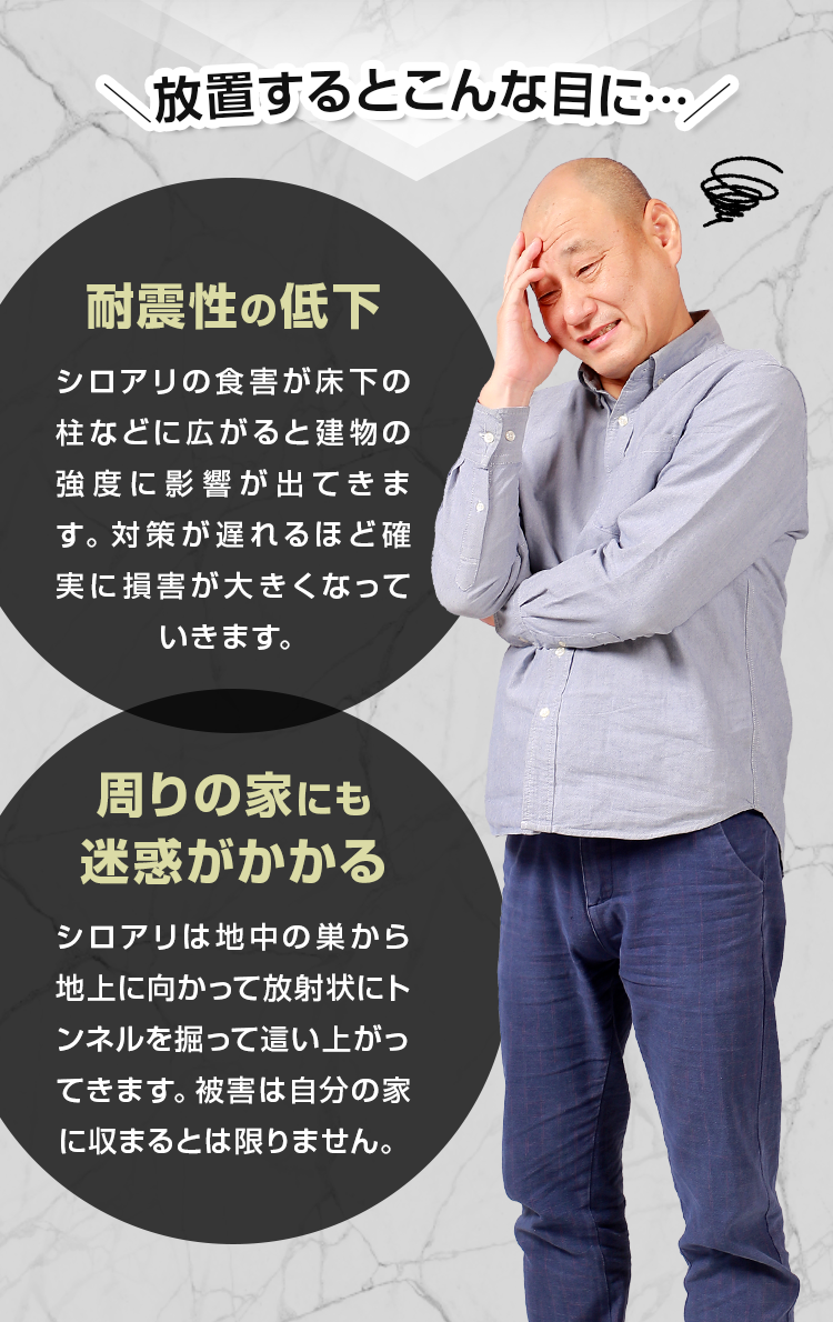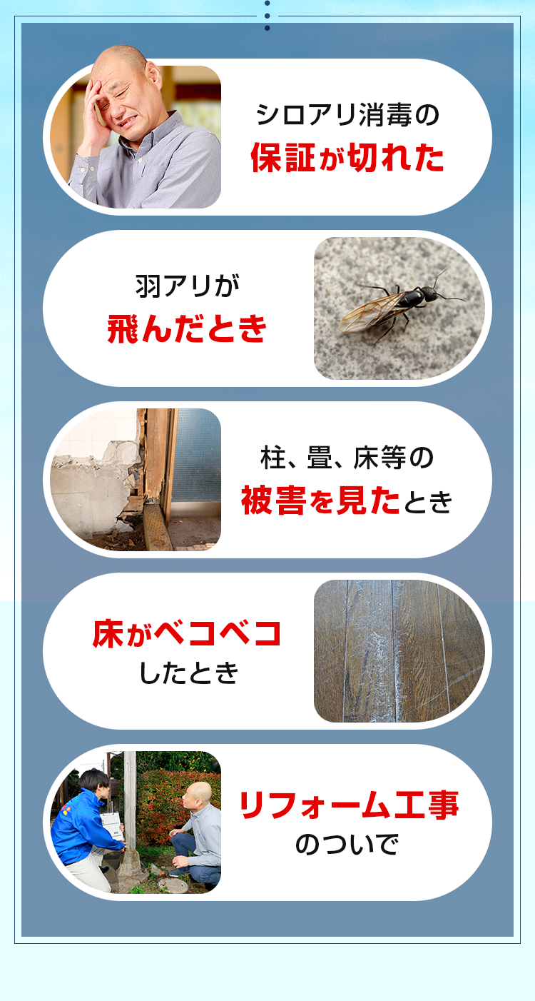 シロアリ駆除サポートではお客様に第一の即対応を心がけています。いつでもお電話をどうぞ!