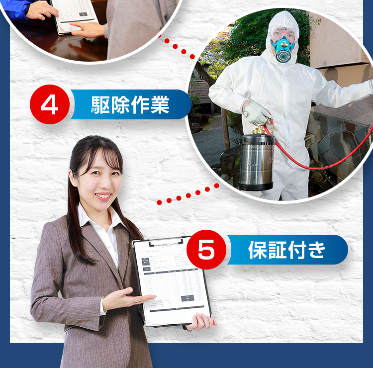 まずは、フリーダイヤル0120-4616-24までご連絡下さい。お客様の状況に適した駆除方法をご提案いたします。
