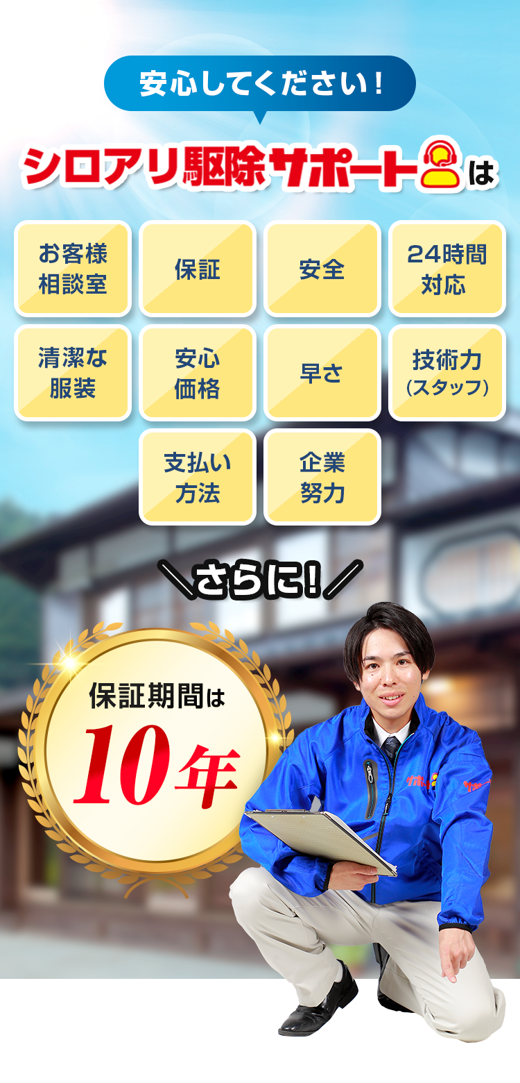 シロアリ駆除サポートの駆除サービスには、施工後10年の保証が備わっています。万が一再発する不安を払拭!